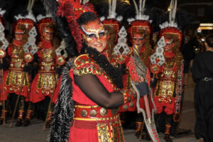 Tras el estandarte le siguieron las escuadras de esta comparsa: Adalisa, Al-samiras, Kammla y Khalida, todas ellas luciendo espectaculares vestimentas, que desprendían la esencia y colorido de las míticas tribus africanas, dándoles un aspecto fiero y terrible, que hacían aún más aguerrido luciendo lanzas y grandes espadones curvos.