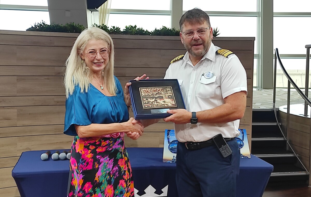 El gigantesco crucero Odissey of the Seas ha realizado su primera escala en València. Francesca Antonelli, jefa de Marketing y Cruceros de la Autoridad Portuaria de València (APV) han sido la encargada de entregar el tradicional socarrat -la baldosa valenciana de barro cocida diseñada con motivos marítimos que Valenciaport entrega a los buques que atracan por primera vez en sus instalaciones- al capitán del barco Per Kristoffersen.