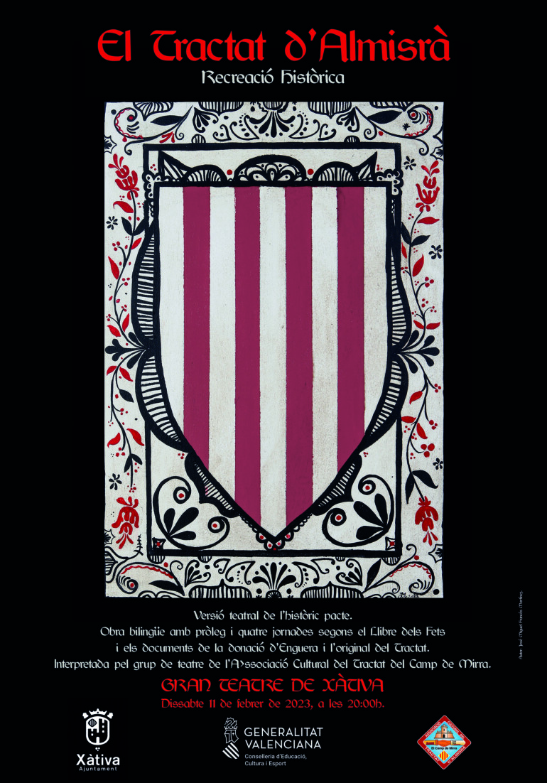 Aquest dissabte 28 de gener tindrà lloc a la sala Noble de la Casa de Cultura (19h) la presentació de l'obra teatralitzada, amb posterior conferència del llibre sobre el 'Tractat d'Almisrà', amb la participació del cronista de la ciutat Agustí Ventura i de l'actor Román Francés Berbegal.