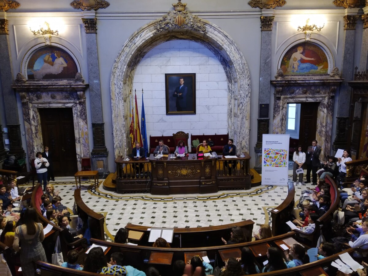 El Hemiciclo Municipal ha acogido esta mañana a las niñas y niños que han participado en el Pleno Extraordinario Infantil celebrado para conmemorar el Día Internacional de la Ciudad Educadora. En el Salón de Plenos se han escuchado las propuestas que han formulado los escolares de sexto de primaria de diferentes colegios de la ciudad. El objetivo, en palabras de la concejala de Educación Maite Ibáñez, es “promover la participación de la infancia y adolescencia de nuestra ciudad para que entre todas y todos construyamos la València que queremos”.