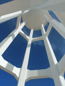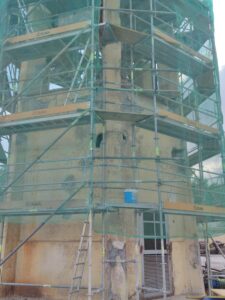 Para la restauración del depósito y su torre de hormigón armado, se han realizado diversos trabajos: se ha saneado y limpiado la estructura de hormigón mediante medios mecánicos manuales, se ha realizado un tratamiento pasivante para la estructura de hierro en mal estado, se ha aplicado 75 litros de un tipo de resina específico (puente de unión) para las zonas en mal estado y se ha utilizado 2600 kilos de mortero de reparación sobre las zonas tratadas de la estructura de hormigón. A continuación, se ha aplicado 340 litros de pintura impermeable de color blanco y azul, para la estructura y el depósito respectivamente, con una aplicación de tres manos de acabado.