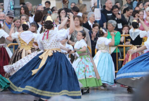 Este viernes por la tarde, la Plaza de la Virgen de Valencia se ha llenado de folclore, música y tradición con la Dansà de las Fallas en dos turnos, infantil a las 20 horas y adulta a las 23 horas.