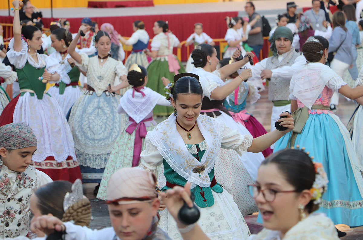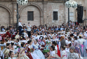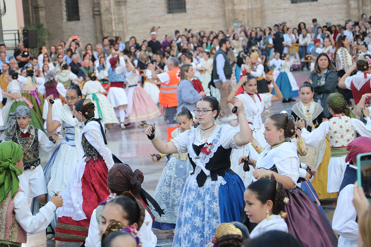 A las 20 horas, el mundo fallero infantil llenaba la plaza con 60 comisiones infantiles participantes. Un total de 388 bailadores y bailadoras a los que hay que añadir a la Corte de Honor de la Fallera Mayor Infantil de Valencia y a la pareja formada por la máxima representante infantil de la fiesta, Marina García Arribas, y Pablo Brull de la comisión Espartero-G. Vía Ramón y Cajal.