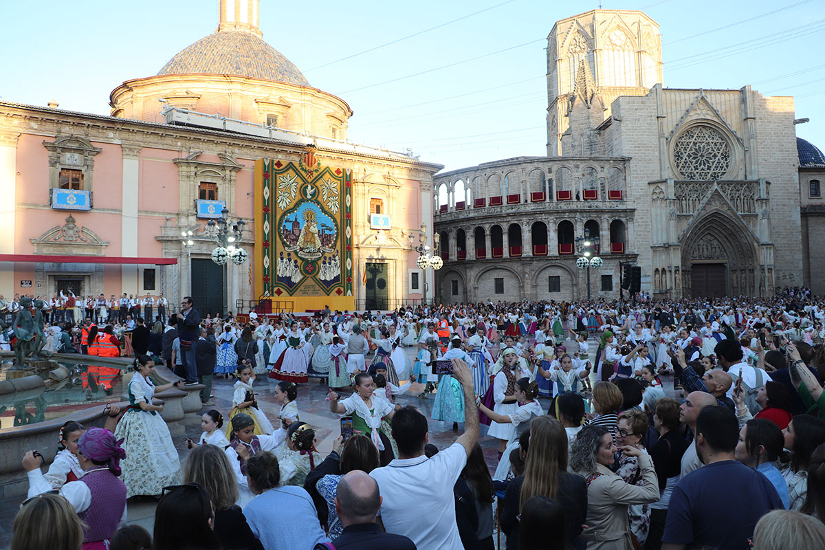 Este viernes por la tarde, la Plaza de la Virgen de Valencia se ha llenado de folclore, música y tradición con la Dansà de las Fallas en dos turnos, infantil a las 20 horas y adulta a las 23 horas.