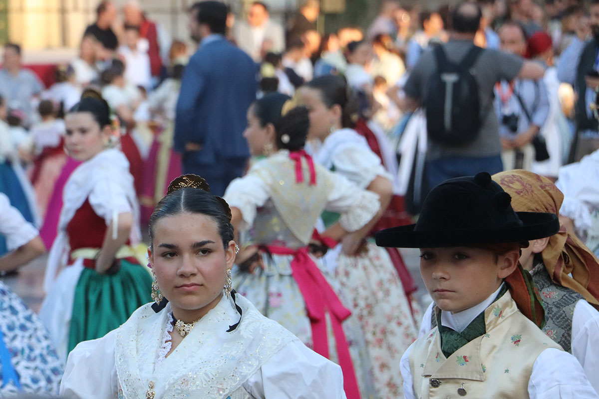 A las 20 horas, el mundo fallero infantil llenaba la plaza con 60 comisiones infantiles participantes. Un total de 388 bailadores y bailadoras a los que hay que añadir a la Corte de Honor de la Fallera Mayor Infantil de Valencia y a la pareja formada por la máxima representante infantil de la fiesta, Marina García Arribas, y Pablo Brull de la comisión Espartero-G. Vía Ramón y Cajal.