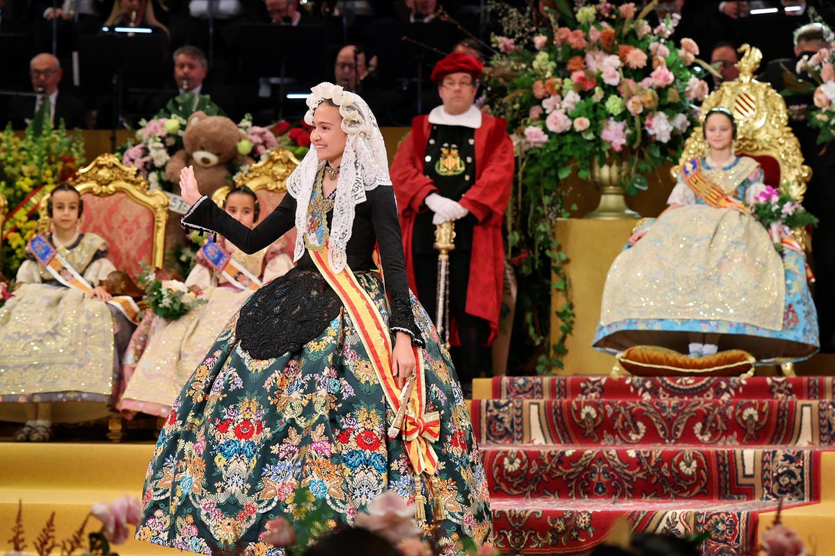 El Palau de la Música se ha vuelto a poner en pie para exaltar a la Fallera Mayor Infantil de Valencia, Marta Mercader Roig, máxima representante del mundo fallero infantil.