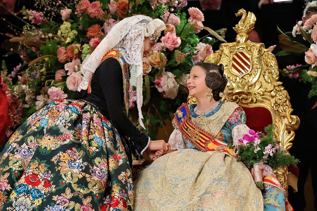 Tras la imposición de bandas a la Corte de Honor Infantil, la voz de Reis Juan ha recitado las palabras que precedían al momento más esperado de toda la tarde, «..pel conjunt de virtuts que atesora i que la fan dignísima portadora de nostra més alta representació, rindam homenatge d’amor i pleitesia a la Fallera Major Infantil de València (…)”