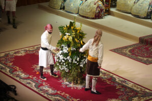 Tras la imposición de bandas que acreditan a María Estela Arlandis ya su Corte de Honor como las mayores representantes de la fiesta valenciana, por los corredores del Palau de la Música han empezado a desfilar preciosas canastillas de flores que han llenado de color el Palau de la Música.