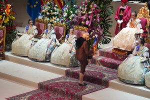 Con la Fallera Mayor de Valencia, María Estela Arlandis, en el centro del escenario ya con la banda y la Joia, todo el público asistente ofrecía un caluroso aplauso de orgullo y aprecio para así acompañarla a ocupar su lugar privilegiado. Es su momento cumbre de la noche y la ilusión vuelve a invadir su rostro engalanado con el aderezo de racimo en oro modelo clásico de la firma Art Antic Joyería exclusivo para la Fallera Mayor de Valencia, y las peinetas que llevan su nombre diseñadas por la firma Alan Indumentaria.