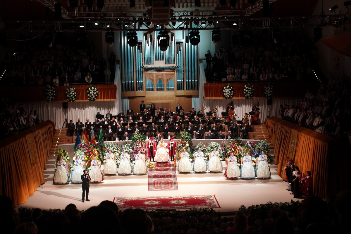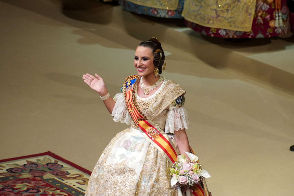 La inconfundible voz de Rafa Marí situaba a todo el patio de butacas en situación para el momento más esperado de la noche: "Valencians i valencianes. De naixement o dret. Estants o habitants de la ciutat de Valencia. És hora de que els fallers vos presentem a la nostra Regina per a rendir-la els honors que la seua distinció mereix. Pel conjunt de virtuts que atresora i que la fan digníssima portadora de nostra més alta representació, retem homenatge d’amor i pleitesia a la Fallera Major de València…".