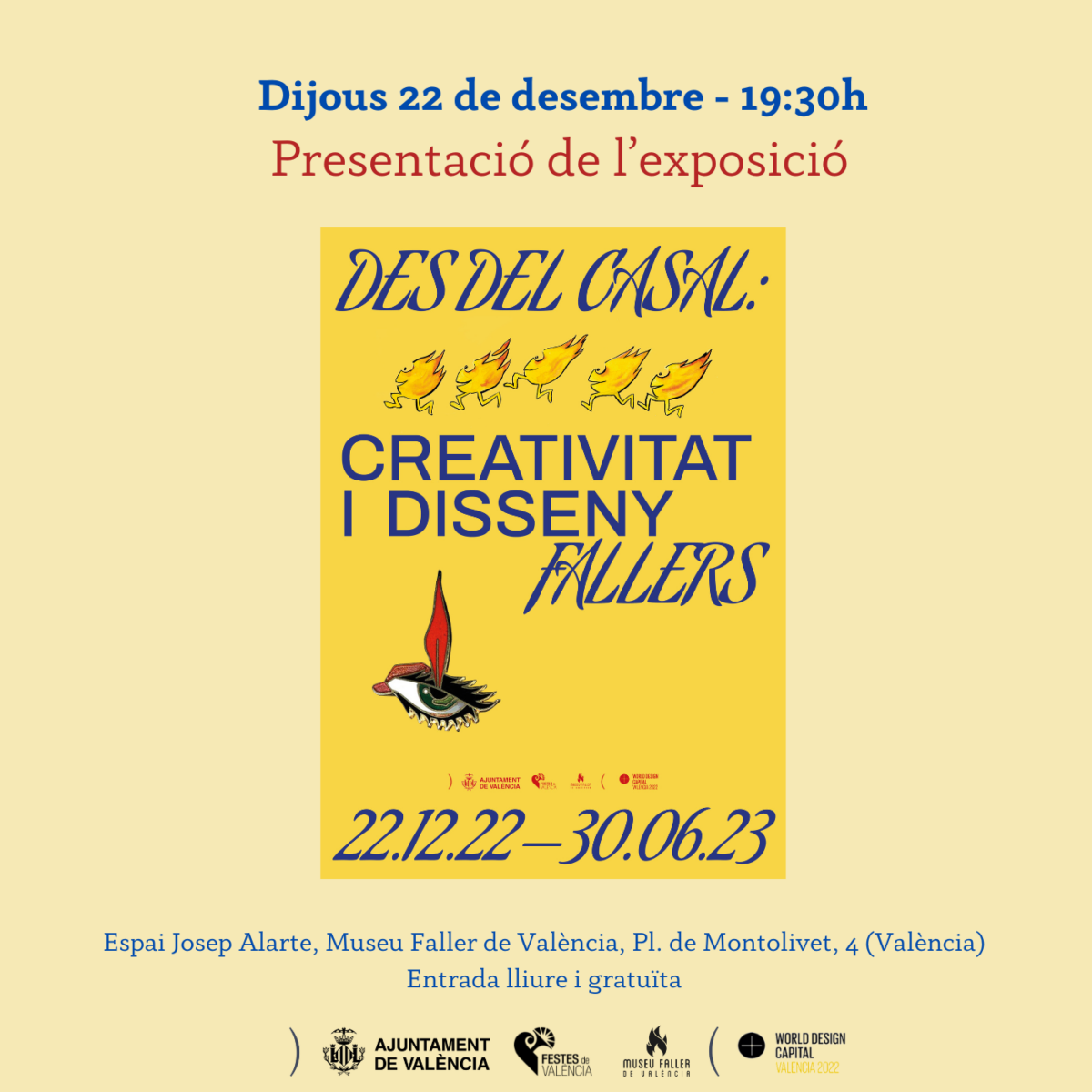 La exposición, que también forma parte de la programación de València Capital Mundial del Diseño 2022, y tal como ha concretado el director del Museo Fallero, Gil Manuel Hernández, está estructurada de la siguiente manera: la sala 1 está dedicada al diseño en el espacio de trabajo y de convivencia en el casal, junto a las mascotas con estilo propio; la sala 2 trata el diseño en cuanto a medios de recaudación (aspecto material y gráfico), criterios visuales de comunicación, así como la innovación y la moda al servicio de los muñecos de marra; finalmente, en la sala 3 se abordan el diseño publicitario, el diseño en las artes escénicas falleras y el diseño editorial. En un monitor también habrá una muestra del diseño audiovisual hecho desde el ámbito fallero.