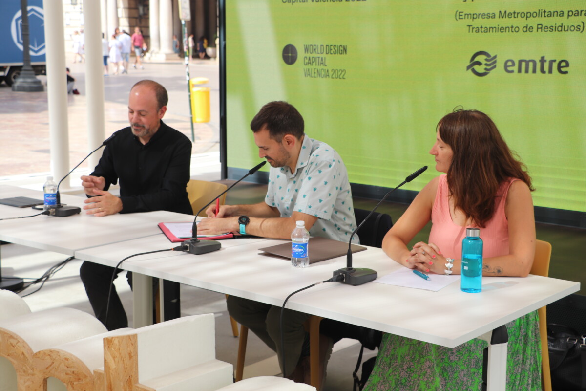 El acto, que ha tenido lugar en el pabellón de la Plaza del Ayuntamiento, ha contado con la participación de Sergi Campillo, presidente de la Entidad Metropolitana para el Tratamiento de Residuos y vicealcalde de València, Sara Bort, gerente de la entidad, y Xavi Calvo, director de València Capital Mundial del Diseño 2022. La presentación del ciclo de iniciativas y talleres ha coincidido con la firma del convenio de colaboración entre ambas organizaciones, en línea con "la necesidad de apostar por el diseño para repensar los procesos industriales y la gestión de residuos en el actual contexto de emergencia climática", según ha relatado Sergi Campillo en su intervención.