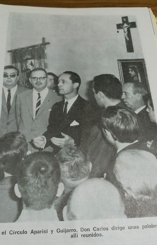 Tres años antes, se inauguró el Círculo Cultural Aparisi y Guijarro, “la casa de todos los carlistas”, gracias al infatigable esfuerzo de muchos carlistas valencianos; pero sí habría que citar la labor de la familia Alamar y Ferrando, en especial de don Rafael Ferrando que fue Requeté durante la Guerra 1936-1939, promotor inmobiliario y constructor de gran parte del actual barrio de Sagunto de la capital levantina. Pronto se convirtió, en la década de los 60’, en la segunda entidad cultural más importante de la ciudad levantina tras el Ateneo mercantil. Y sin duda, uno de los actos más importantes en sus primeros años de existencia fue la visita a la ciudad de Valencia y a los Altos hornos de Sagunto del que hasta entonces le estaba disputando la carrera dinástica a Juan Carlos de Borbón: don Carlos Hugo de Borbón Parma.