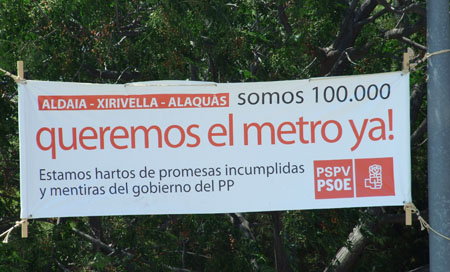 La reunión del pasado 8 de julio entre el conseller de Transportes, Mario Flores, y los alcaldes de Aldaia, Empar Navarro, Alaquàs, Elvira García, y Xirivella, Josep Soriano, puso de manifiesto, según el PSPV, “la falta de planificación de la Generalitat para acercar el metro a las tres poblaciones” a pesar de que “desde 1999 Zaplana, Camps, González Pons o Cotino han estado prometiendo el metro en campaña electoral, pero ahora, diez años después, el conseller Mario Flores fue incapaz de plantear una solución clara y con plazos concretos”.