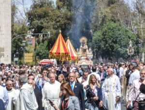 En la procesión de regreso a la Basílica se ha detenido en la calle de la Paz a la altura de la Iglesia Santo Tomás Apóstol y San Felipe Neri. Durante todo el recorrido iglesias y parroquias han volteado a mano sus campanas. A su llegada a la Basílica ha sido recibida con los cantos de la Escolanía y con numerosos fieles abarrotando el templo.