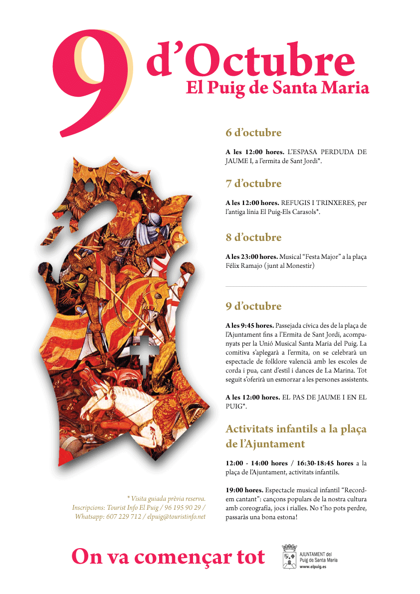 Al día siguiente, los actos centrales del día 9 de octubre tendrán lugar a partir de las 9:45 horas, con el tradicional paseo cívica desde el Ayuntamiento hasta la emblemática ermita de Sant Jordi, donde habrá un espectáculo de danzas y música tradicional valenciana que irá a cargo de las escuelas de cuerda y púa, canto de estilo y danzas valencianas del centro cultural municipal La Marina. A continuación, se ofrecerá un almuerzo a las personas asistentes.