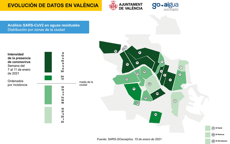 Si bien los barrios mencionados son donde mayor presencia del virus se ha localizado, por encima de la media de la ciudad también se encuentran Castellar, Jesús y Patraix. Con niveles también significativos, pero por debajo de la media se sitúan Malilla, Ciutat Vella, Poblats Marítims, Benimaclet, Arrancapins, Tres Forques, Olivereta, Fuensanta y Sant Marcel·lí. Las zonas en las que la incidencia es menor corresponden a Russafa, El Saler, Nazaret, el Perellonet, Poblats Marítims y El Palmar.