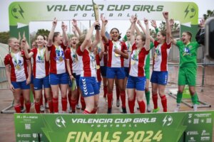 Cronológicamente, las finales siguieron con la categoría de menor edad en esta edición de la Valencia Cup Girls, con la sub’12 en fútbol 8. Y hubo derbi, una semana antes de que Valencia y Levante se encuentren en la Liga F en Mestalla. En este caso sus equipos formativos buscaron el título de este torneo internacional femenino de fútbol base. La victoria fue blanquinegra por 2-0 y el MVP fue para la valencianista Carmen Matas, quien precisamente llegaba tras haber logrado el reconocimiento de mejor jugadora en el campeonato de España sub’12 conquistado por la Comunidad Valenciana. Fernando Brotons, también director del campeonato, desarrollado en la Ciudad del Turia entre el 28 y el 31 de marzo, hizo entrega de las medallas y los trofeos.
