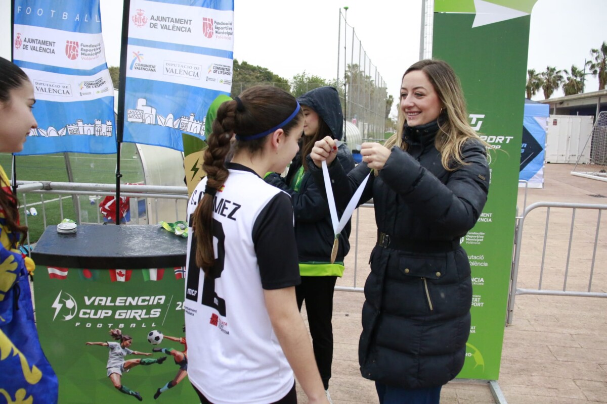 Cronológicamente, las finales siguieron con la categoría de menor edad en esta edición de la Valencia Cup Girls, con la sub’12 en fútbol 8. Y hubo derbi, una semana antes de que Valencia y Levante se encuentren en la Liga F en Mestalla. En este caso sus equipos formativos buscaron el título de este torneo internacional femenino de fútbol base. La victoria fue blanquinegra por 2-0 y el MVP fue para la valencianista Carmen Matas, quien precisamente llegaba tras haber logrado el reconocimiento de mejor jugadora en el campeonato de España sub’12 conquistado por la Comunidad Valenciana. Fernando Brotons, también director del campeonato, desarrollado en la Ciudad del Turia entre el 28 y el 31 de marzo, hizo entrega de las medallas y los trofeos.