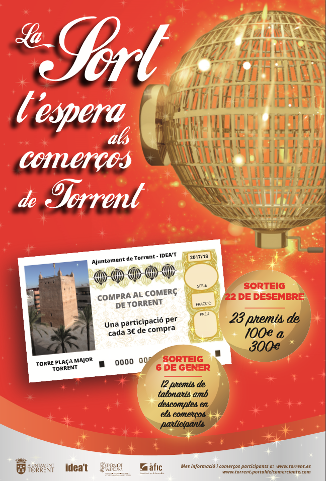 El Nadal arriba a Torrent i el Consistori, mitjançant l’empresa municipal IDEA’T, ha dissenyat una campanya per a fomentar el comerç local en estes dates tan assenyalades. La campanya nadalenca La sort t’espera als comerços de Torrent se centra en dos fases: sorteig de Nadal -22 de desembre de 2017- i sorteig de Reis -6 de gener de 2018-. En la primera fase es sortejaran un total de 23 premis amb una bonificació de 100 a 300 euros per a gastar als comerços locals.