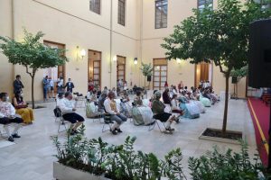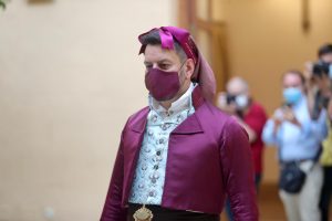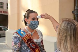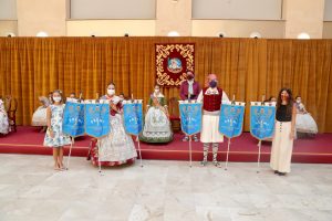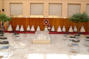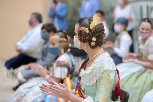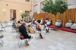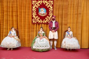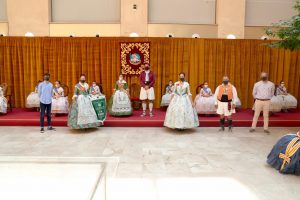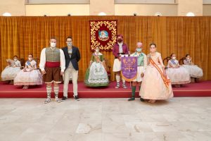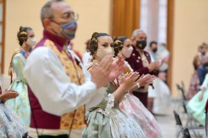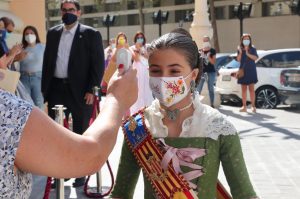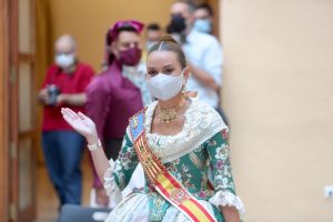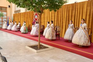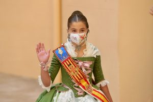 Després d’un xicotet descans i amb l’arribada de la meitat del matí era el moment que els i les infantils falleres prengueren protagonisme a l’acte. Feia entrada al pati del Palau la Fallera Major Infantil de València, Carla García, acompanyada de la seua Cort d’Honor. Totes tretze, amb el tratge de valenciana i la respectiva mascareta per complir amb tots els protocols establerts.