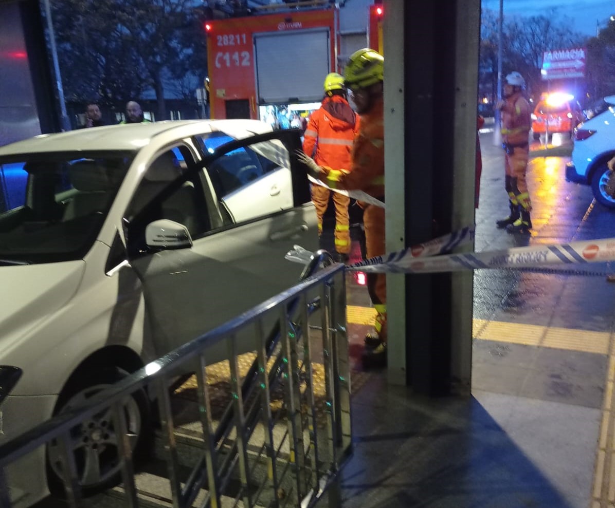 Tras quedar el coche empotrado en las escaleras de la estación de metro, hasta el lugar se han movilizado bomberos de Paterna que, junto con agentes de la Policía Local, se han hecho cargo de esta situación.