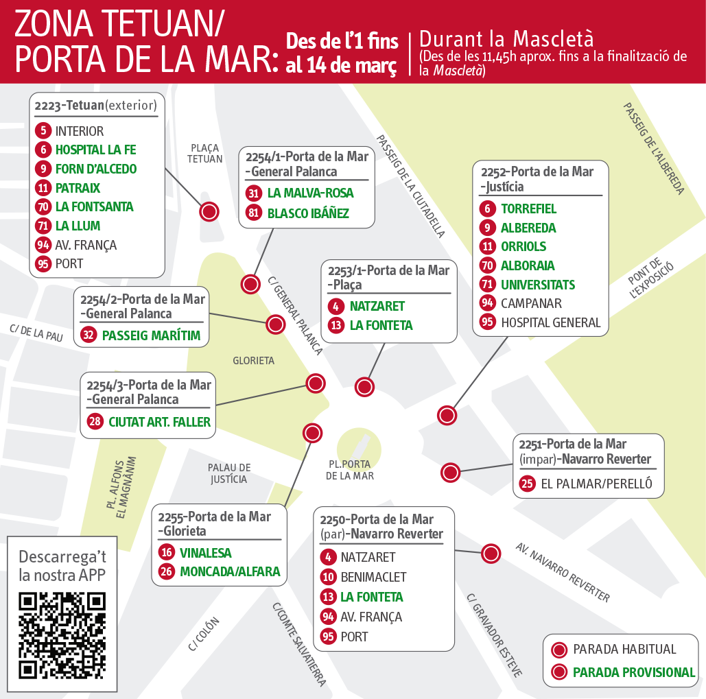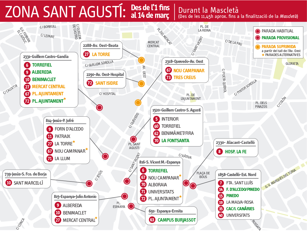Desde el 1 al 14 de marzo el tráfico estará restringido desde el intercambiador Tetuan-Porta de la Mar hasta la plaza de Sant Agustí durante la mascletà y los autobuses no podrán circular por el anillo interior. Por eso, desde las 11:45h. hasta que finalice la mascletà -a partir de las 14:30h.-, se creará un gran punto de intercambio en la zona de Porta de la Mar-Tetuan, donde harán parada las líneas habituales y se habilitarán paradas provisionales para otras 19 líneas. Lo mismo ocurrirá en el entorno de Sant Agustí, donde harán parada las líneas habituales y otros once de forma provisional.