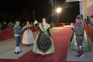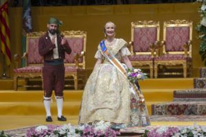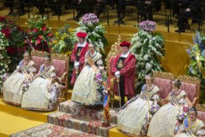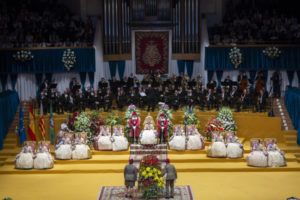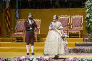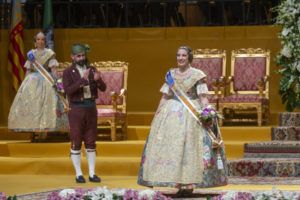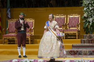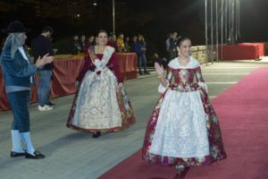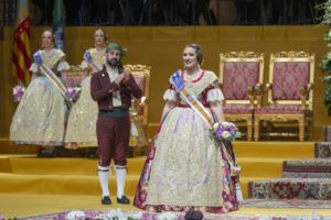 El Presidente de Junta Central Fallera, Pere Fuset, esperaba en el escenario a las 12 chicas que componen la Corte de Honor de la Fallera Mayor de Valencia. Él era el encargado de hacerles imposición de su banda y la joia que las acredita como máximas representantes del mundo fallero. Una a una iban ocupando los tronos que se habían dispuesto en el escenario esperando recibir a su Fallera Mayor en una noche mágica para todas ellas.