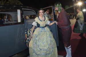 Pere Fuset, Presidente de Junta Central Fallera, y Rosángeles Valls, su mantenedora, la esperaban ya para partir hacia el Palau de la Música en un Rolls Royce Phantom III del año 1937. Las doce mujeres de su Corte de Honor le precedían en este particular periplo, por parejas, también en coches de época.