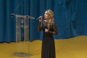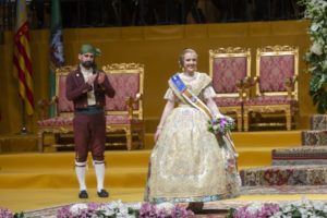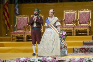 Y llegaba uno de los momentos más esperados cuando la Fallera Mayor de València, Marina Civera, subía al escenario de la sala Iturbi ensalzada por una sinfonía de aplausos por parte de todos los asistentes. Marina saludaba con una sonrisa radiante que delataba su inmensa felicidad en un momento mágico hasta que el alcalde Joan Ribó le imponía la banda que la acredita como Fallera Mayor de València. Posteriormente, Pere Fuset le imponía la Joia.