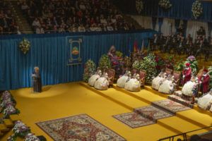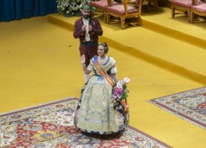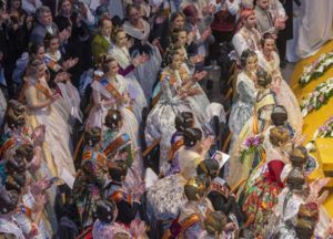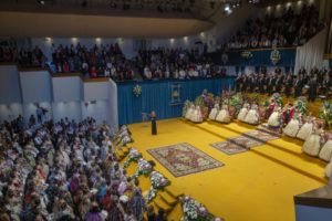 Con Marina ya en su trono, quedaba el homenaje floral que gran parte de las entidades y colectivos más relevantes de la ciudad, tanto festivos como oficiales y hasta deportivos, brindaban a nuestra Fallera Mayor de València, que no cesaba en su sonrisa y profunda emoción. Y con cada nueva ofrenda, la fragancia se iba apoderando del auditorio en una de las más hermosas estampas que el acto ofreció.