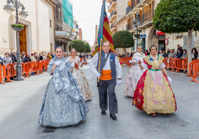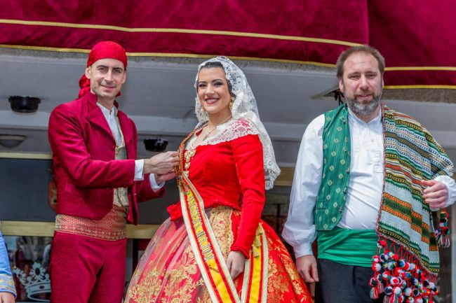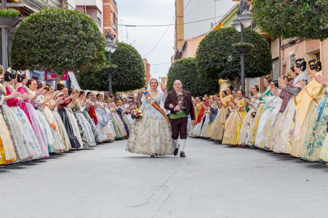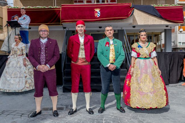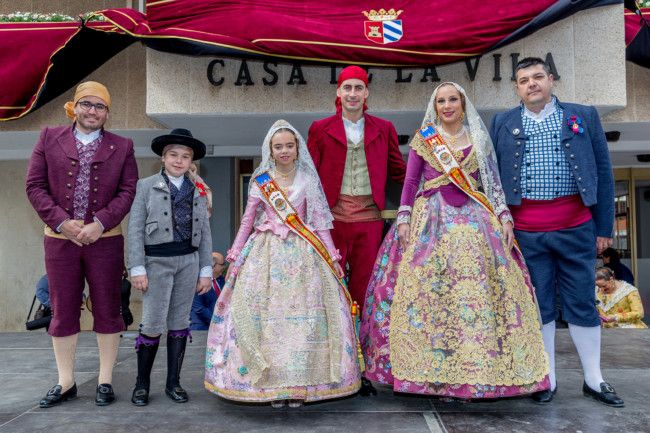 Una a una, todas las comisiones han ido entrando en la plaza del Ayuntamiento, presididos por sus falleras mayores y presidentes. Una vez allí, han sido recibidos primero por el presidente de la Agrupación, José Antonio García, a los pies de la imagen de la patrona y de San José, y posteriormente han subido al escenario para saludar a las autoridades locales, representadas por el alcalde, Carlos Fernández Bielsa, y el concejal de Fiestas, Toni Arenas.