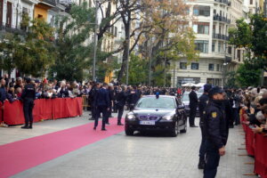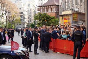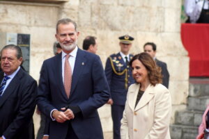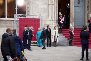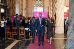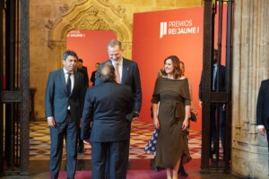 Seguidamente, y tras acceder al interior, Don Felipe saludó a la presidenta de las Cortes Valencianas, Llanos Massó; a la delegada del Gobierno en la Comunidad Valenciana, Pilar Bernabé; al jefe del Cuartel General Terrestre de Alta Disponibilidad, Fernando García Vaquero; a los representantes de los jurados y a los miembros del Patronato de la Fundación 'Premios Rei Jaume I'.