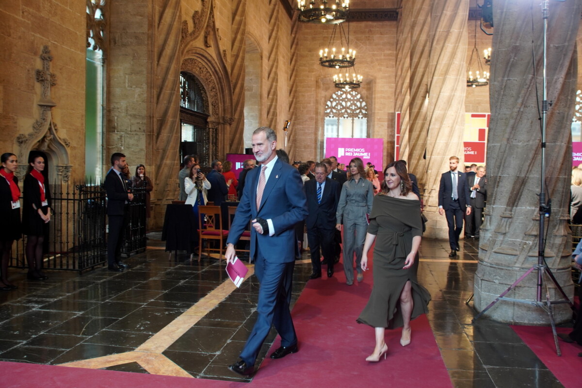Felipe VI ha presidido este martes la ceremonia de entrega de los prestigiosos Premios Rei Jaume I, celebrada en la Lonja de la Seda de Valencia. A su llegada a la Lonja de los Mercaderes, Su Majestad el Rey ha sido recibido por el presidente de la Generalitat Valenciana, Carlos Mazón; la alcaldesa de Valencia, María José Catalá; el presidente de la Fundación Valenciana Premios Rey Jaime I, Vicente Boluda; y por el presidente ejecutivo y secretario de la Fundación Valenciana Premios Rey Jaime I, Javier Quesada, entre otras autoridades.