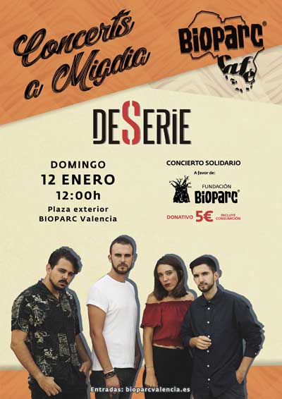 Y el domingo 12 de enero a las 12h dentro de Concerts a Migdia el grupo valenciano Deserie ofrecerá una actuación solidaria en la plaza exterior de Bioparc a beneficio de la Fundación Bioparc. La compra anticipada (5€ con consumición) puede realizarse en la taquilla on line.