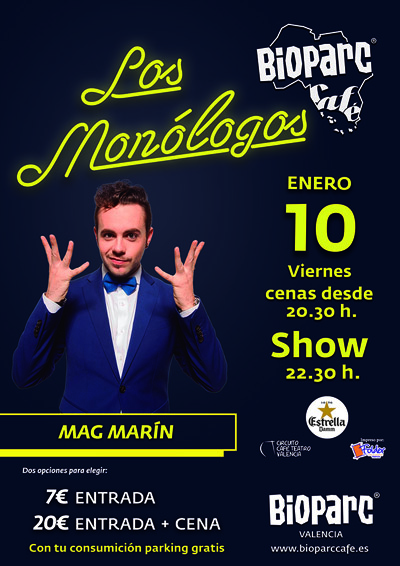 Bioparc Café comienza el ciclo de Los Monólogos de 2020 este viernes 10 de enero a las 22:30h. con un mago que, con su show, no deja indiferente a ningún espectador. José Marín Tello, conocido escénicamente como Mag Marín, estudió Magisterio pero hizo de la magia su modo principal de vida desde 2008. Su representación tiene toneladas de un humor atrevido, no siempre políticamente correcto, pero siempre eficaz y cómplice. Nacido en Granollers en 1989 y a pesar de su juventud, ya cuenta con el gran Galardón Magicus (2012), el premio Nacional de magia de España (2014) y de Francia (2015), además de ganador de la primera edición del programa Pura Magia de RTVE.