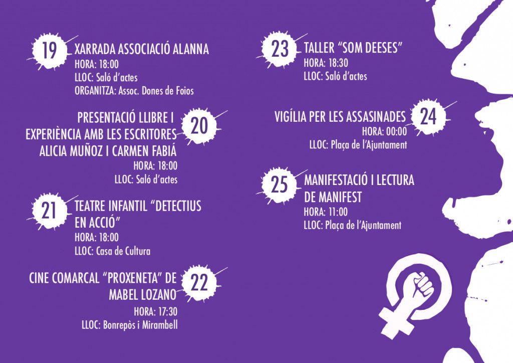 Ja dissabte 23, a la Sala d’Actes i des de les 18.30, tindrà lloc el taller d’empoderament ‘Som deesses’. I diumenge tindrà lloc un dels actes més solemnes, la vigília per les assassinades, quan a la plaça de l’Ajuntament, a mitjanit, s’encendrà una espelma per cada una de les dones que han mort a mans de la violència masclista. La programació finalitzarà el dilluns 25 de novembre amb la manifestació i lectura del manifest a les 12.00 hores a la plaça de l’Ajuntament.