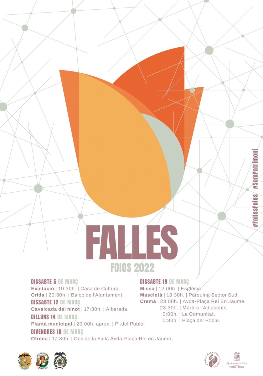 La Junta Local Fallera de Foios y la Concejalía de Fiestas y Fallas han preparado y organizado una programación para las Fallas de 2022 que recuperan la normalidad, a excepción de la obligatoriedad de utilizar la mascarilla en espacios interiores y en aquellos espacios exteriores donde se produzcan aglomeraciones.