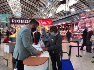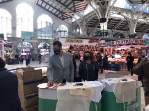 El concejal delegado de Comercio, Carlos Galiana, ha participado este martes en la campaña «Més Mercat», que impulsa la Concejalía para animar a las personas consumidoras a comprar productos frescos y de temporada en los mercados municipales. Galiana se ha acercado hasta el Mercado Central donde, durante esta mañana, todas las personas realizan sus compras están siendo obsequiadas con bolsas, camisetas, delantales y mascarillas con la imagen de la campaña de la Concejalía de Comercio.