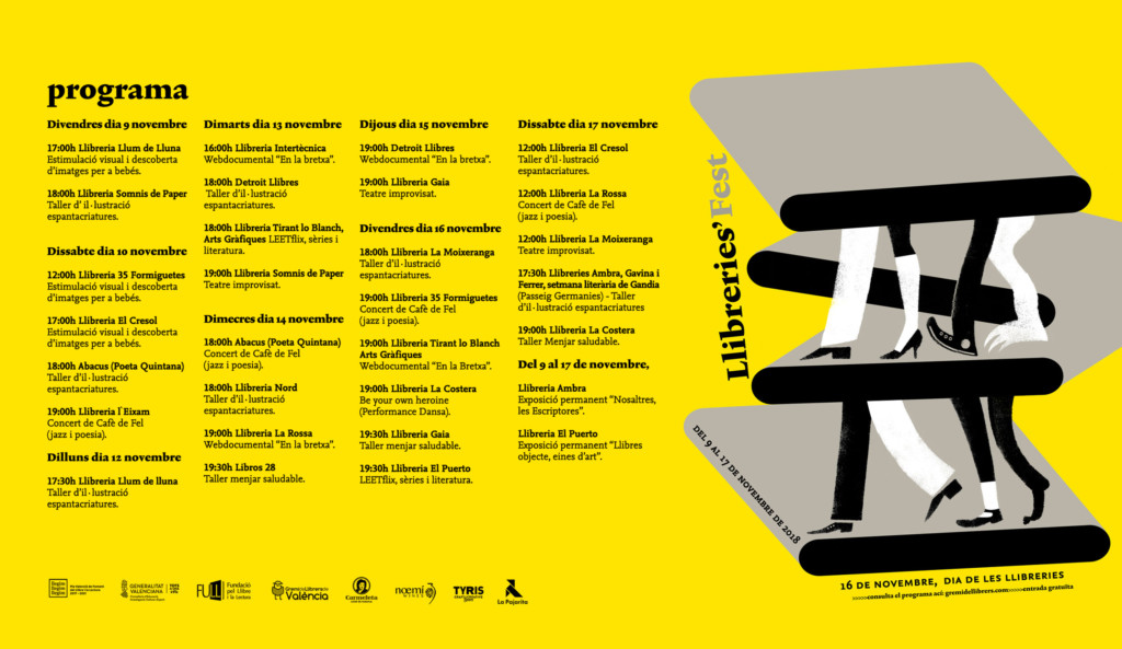Del 9 al 17 de novembre les llibreries valencianes es convertiran en escenaris teatrals, espais gastronòmics o sales de concerts i de cinema. Amb motiu del dia de les llibreries, 16 de novembre, el Gremi de Llibrers de València, juntament amb la Fundació FULL, organitzen per segon any consecutiu la campanya ‘Llibreries’ Fest’, abans anomenada ‘Llibreria, espai cultural’. Totes les activitats són gratuïtes.