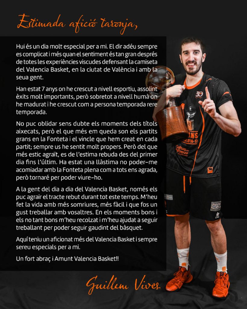 El Valencia Basket ha agradecido la profesionalidad, la entrega y el trabajo realizados por Guillem Vives durante el tiempo que ha defendido la camiseta taronja, así como su disponibilidad y sacrificio por el bien del equipo, y le ha deseado lo mejor en su futuro, tanto a nivel profesional como personal, sentimiento al que nos unimos .