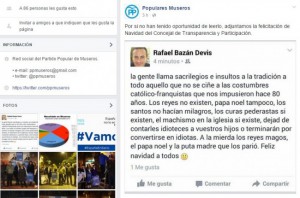 La felicitación navideña del concejal de Participación y Transparencia del Ayuntamiento de Museros, Rafa Bazán, colgado en su muro personal de facebook, parece que no ha gustado a todo el mundo. Más bien a nadie ya que incluso el propio edil la borró de su muro horas después de publicarla. Pero no tan rápido para […]
