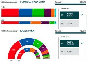 Las Elecciones Generales han deparado en la Comunitat Valenciana un leve cambio en lo que al reparto de escaños entre bloques se refiere y así, aunque el PSPV-PSOE reedita vuelve a ser la fuerza más votada, el bloque de la derecha cobraría una leve ventaja sobre la derecha, al 100% del escrutinio. PSPV-PSOE ha obtenido […]