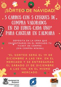 Cinco carros de la compra valorados cada uno de ellos en 150 de euros es el premio que, de cara a Navidad, se pueden llevar los clientes del Mercado Municipal L’Almara. El Sorteo de Navidad que ha puesto en marcha el mercado municipal cuenta con la colaboración del Ayuntamiento de Burjassot, desde la concejalía de […]