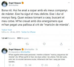 El concejal de Compromís per Burjassot, Ángel Vázquez, sufrió anoche una agresión homófoba perpetrada por dos individuos que lo asaltaron y lo golpearon al grito de ‘Maricón de mierda’, según ha relatado él mismo esta mañana en sus redes sociales. Vázquez salió la noche del jueves a cenar con unos compañeros y cuando regresaba a […]