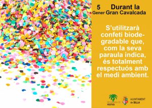 Durant la Gran Cavalcada que els Reis Mags realitzaran a Silla, s'utilitzarà confeti biodegradable, totalment respectuós amb el medi ambient. I es que aquest confeti es desfà al contacte amb l'aigua, segons ha informat l’Ajuntament del municipi. Això és gràcies a que està fabricat amb paper d'arròs, el que permet la seua ràpida descomposició, es […]