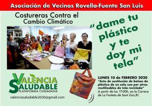 El próximo lunes 10 de febrero a las 17:00 en el número 81 de la Carrera de la Fonteta de Sant Lluis, de València, la Plataforma ciudadana València Saludable realizará un nuevo acto de sustitución de bolsas de plástico de un sólo uso por otras reutilizables de tela reciclada a las puertas de uno de los […]