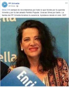 La secretaria general del PP de Xirivella, Silvia Ortí, murió ayer domingo 29 de julio por la mañana por la complicación de los problemas cardiovasculares que sufría desde hace años pese a contar con apenas 50 años de edad. El PP de Xirivella anunció ayer su pérdida en las redes sociales con un mensaje de […]
