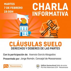 Ciudadanos de Massanassa ha organizado una charla informativa para los vecinos de la población en la que, gracias a la colaboración del despacho profesional Asensio García Abogados, se procurará informar a los ciudadanos sobre las tristemente famosas Cláusulas Suelo. ¿Qué son las cláusulas suelo? ¿Por qué son ilegales? ¿Cómo saber si se tiene una cláusula […]