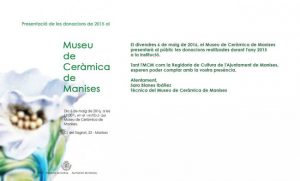 Mañana, 6 de mayo, a las 19 horas, en el vestíbulo del Museo de Cerámica de Manises se presentarán las donaciones cerámicas que se han incorporado en el Museo durante el año pasado. En un acto abierto al público, se hará mención de la donación de 95 publicaciones relacionadas con la producción de cerámica, materia […]